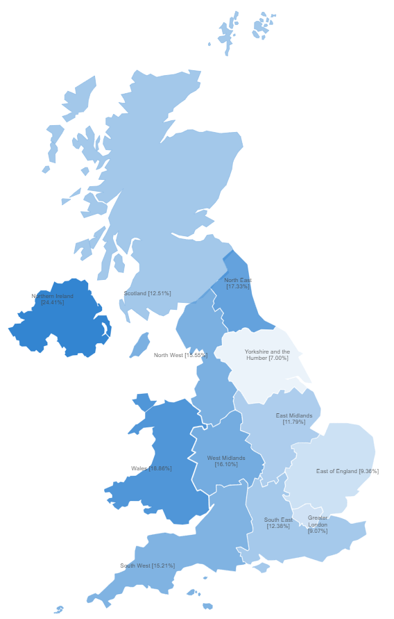The worst affected regions throughout winter 2022-23 were Northern Ireland, with an average HFPI percentage of 24.41%, followed by Wales, 18.88%, and North East England, 17.33%. London was the best performing region at 9.07%, followed by the East of England at 9.36%.